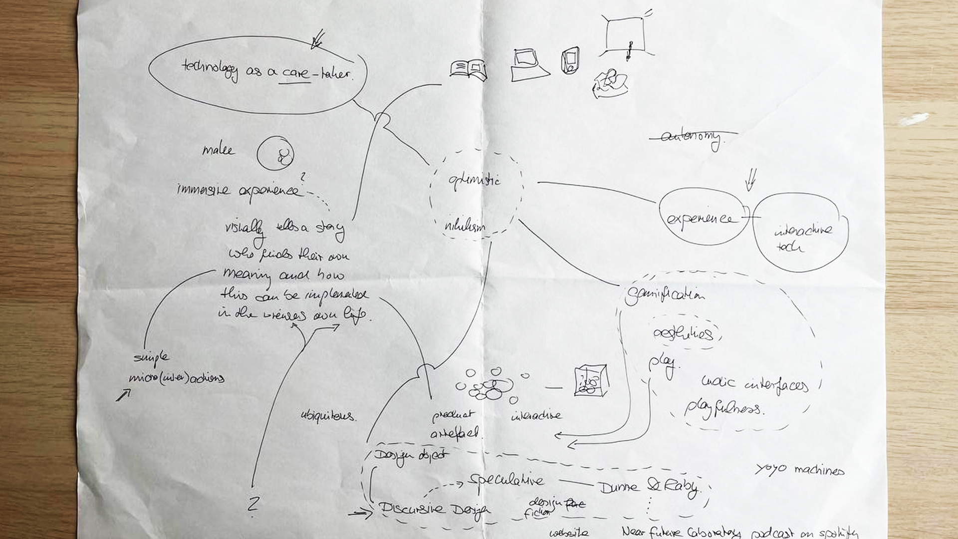 We circled the important terms together, selecting sub-topics that had the most potential. Before this, I was already focused on narrowing down my topic to just autonomy - one of the sub topics of optimistic nihilism. Andreas told me that this was not a good idea, which is how we started with this. Technology as caretaker Interactive technology for user experience Gamification Discursive design