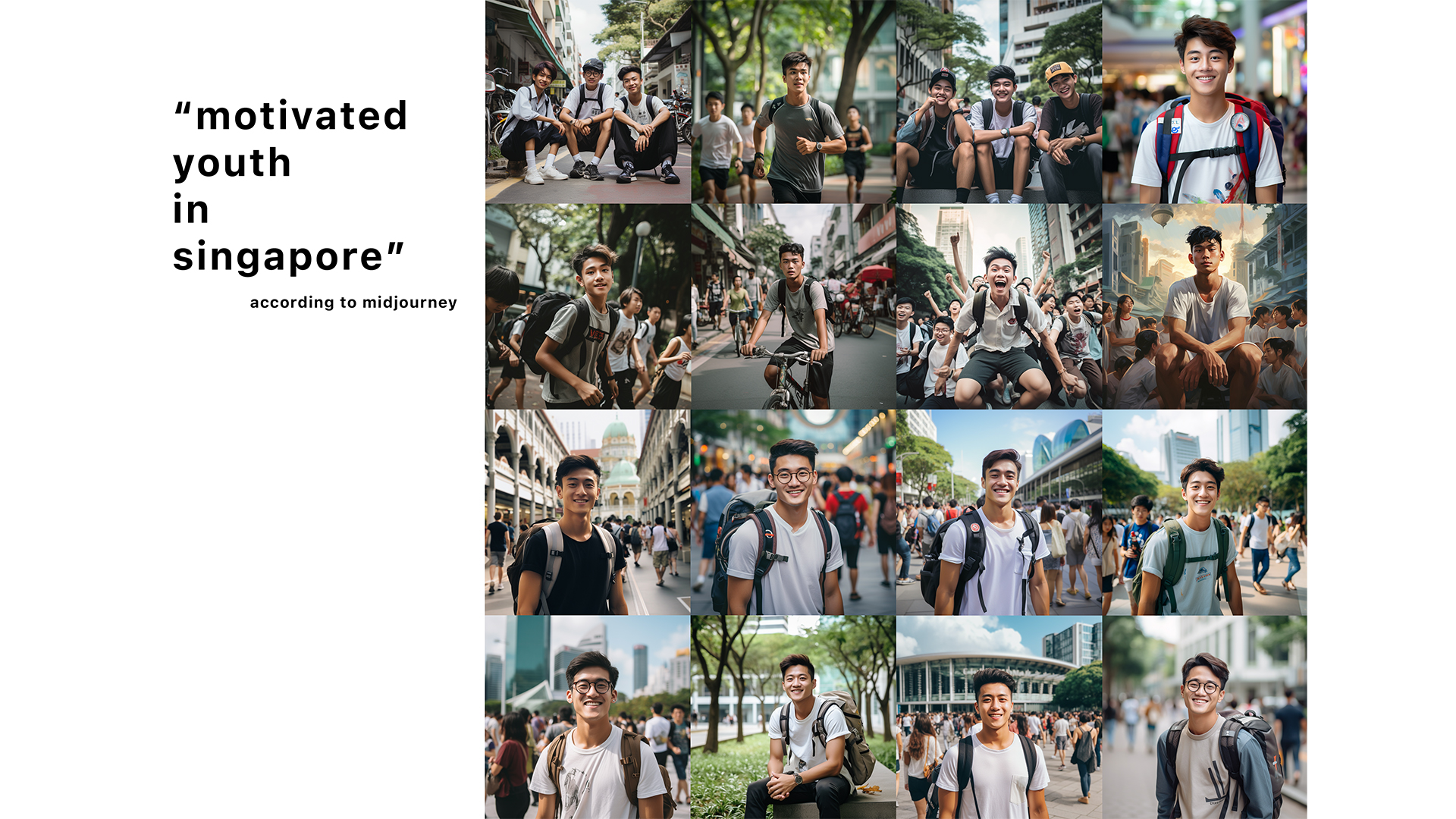 As for ethnicity and gender, this may not be relevant to the research. It suggests socially inclined controversies such as misogyny, feminism and whatnot. Despite prompting the key terms ‘in Singapore’, MidJourney does not recognise that it is a multi-racial and multicultural society. Not something I want to dive into.